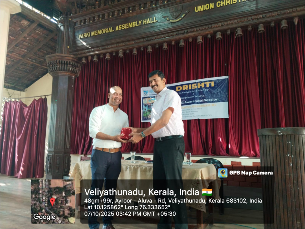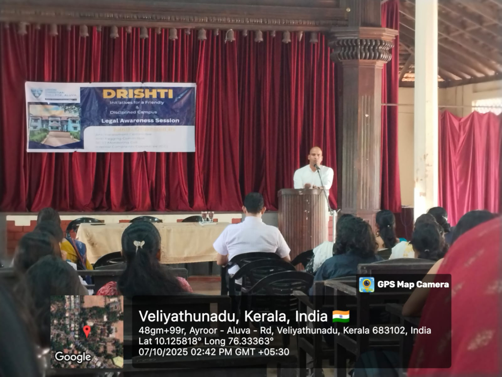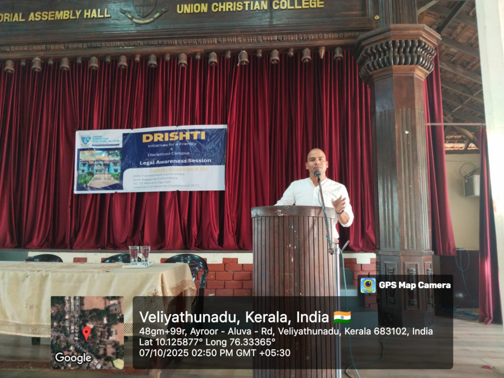 Union Christian College, Aluva organized a Legal Awareness Session in association with the Anti-Harassment Cell, Anti-Ragging Cell, SC/ST Monitoring Cell, and the Internal Complaints Committee (ICC) on October 7,2025.The session aimed to educate students and staff about their rights and the institutional mechanisms available for ensuring a safe campus environment. The resource person, Adv.Jino K.P an experienced Panel lawyer, TLSC, Aluva, delivered an insightful talk on the relevant laws, complaint procedures and students ‘ rights stressing the importance of proactive reporting and support.