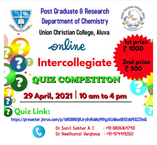 The post-graduate & research department of Chemistry, Union Christian College Aluva is conducting an intercollegiate online Quiz competition.