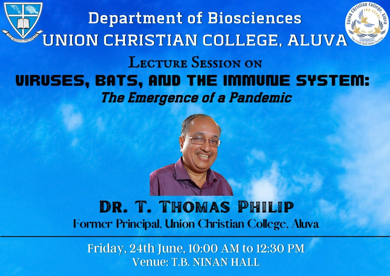 The Department of Biosciences, Union Christian College, Aluva, is conducting a seminar on “VIRUSES, BATS, AND THE IMMUNE SYSTEM: The Emergence of a Pandemic”