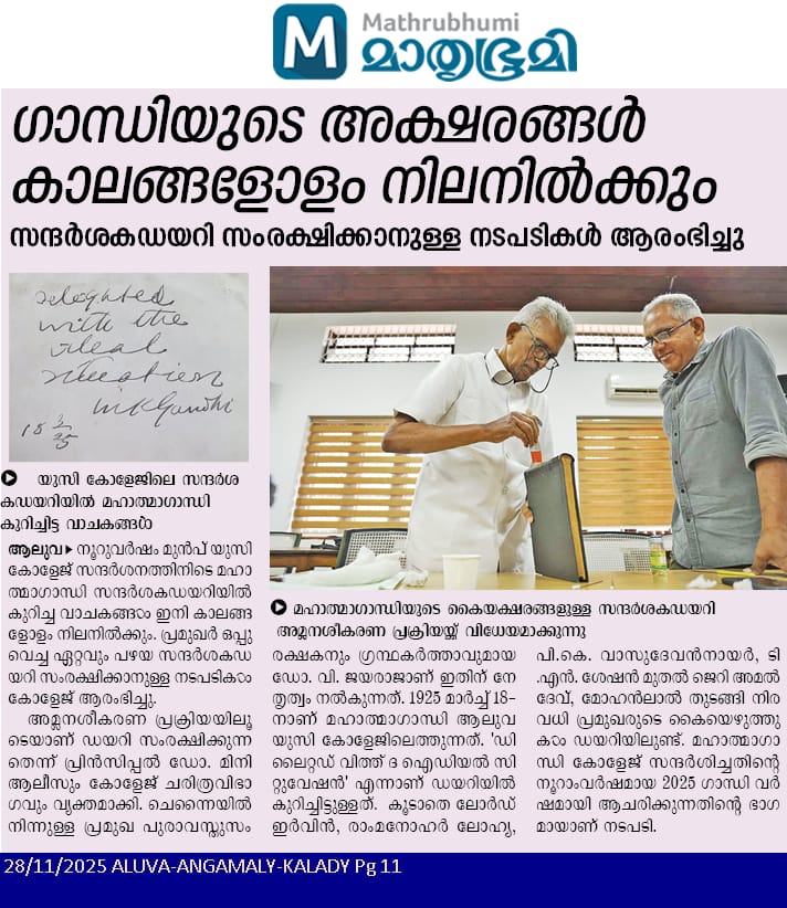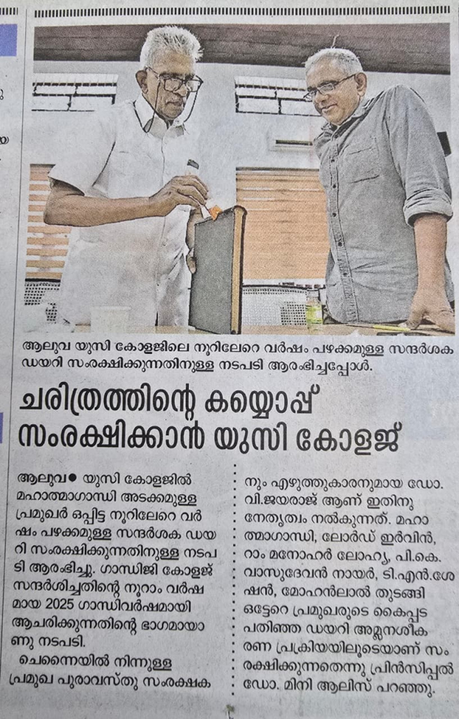 Union Christian College, Aluva, has initiated steps to preserve its oldest visitor’s diary, which bears the signatures of eminent personalities including Mahatma Gandhi. The move is part of the college’s plan to observe 2025 as ‘Gandhi Year’, marking the centenary of Mahatma Gandhi’s visit to the campus in 1925.