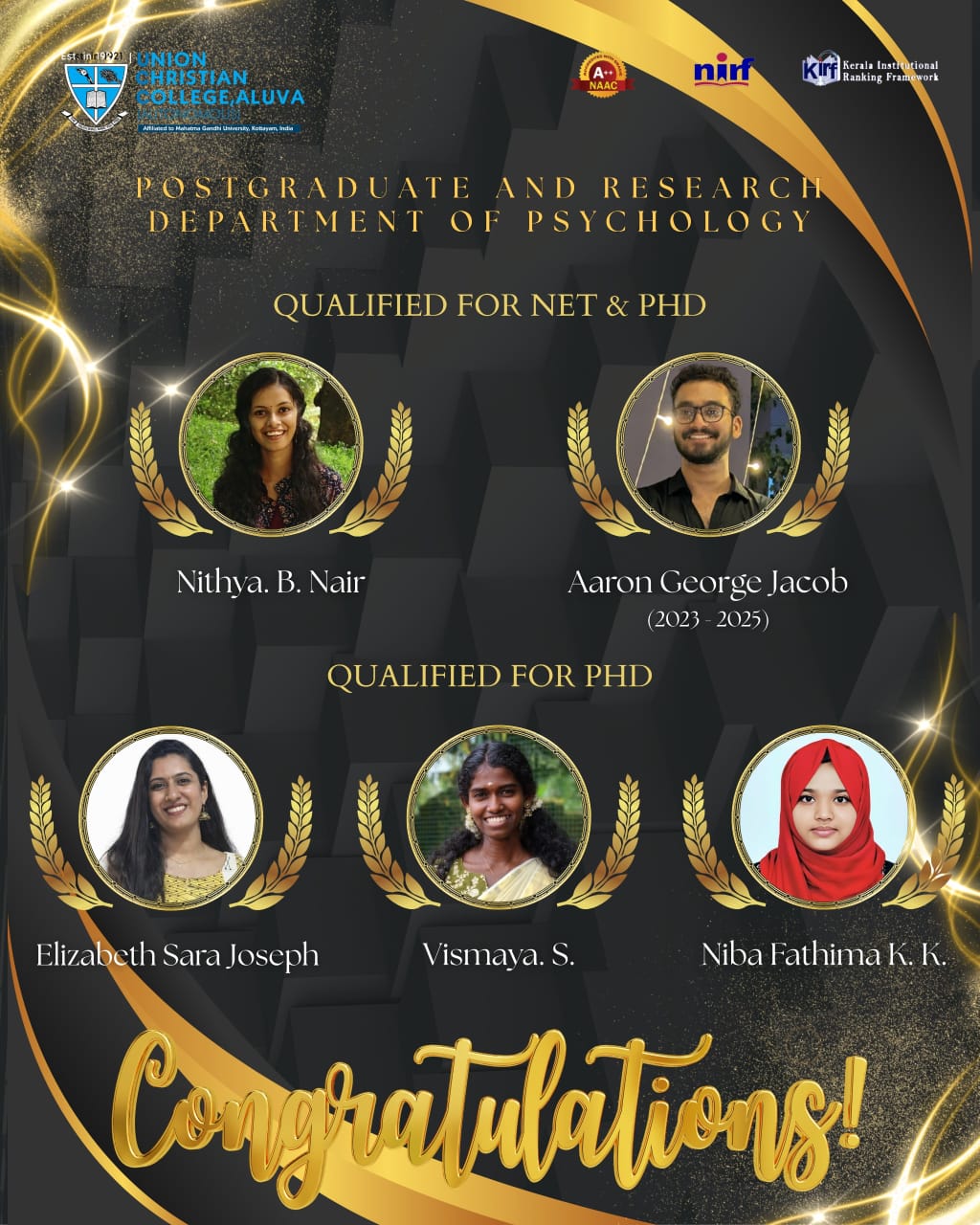 Congratulations to the students of the Department of Psychology on qualifying for NET and PhD.