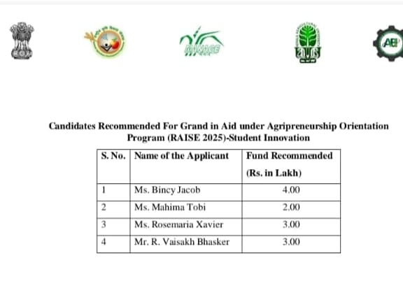 Hearty congratulations to Ms Bincy Jacob, Assistant Professor, Biosciences Department for being selected under the grant-in-aid RKVY–RAFTAAR Agri-Business Incubation Programme, Kerala Agricultural University.