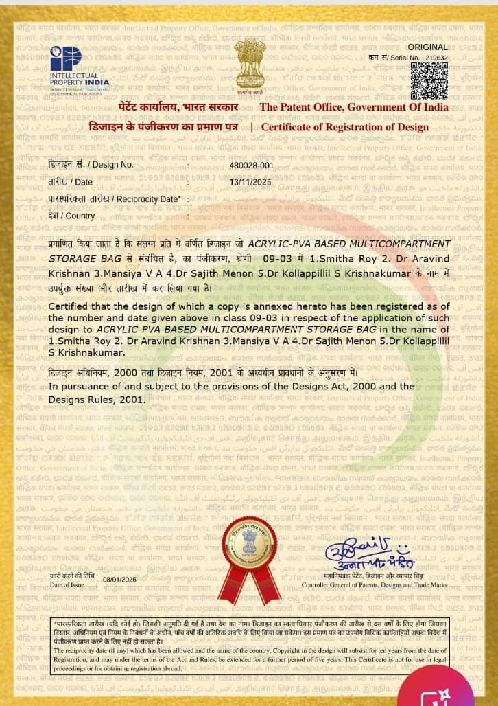 Chemistry department faculty member Ms. Smitha Roy and our former MSc student Ms. Mansiya has secured a design patent on ACRYLIC-PVA BASED MULTICOMPARTMENT STORAGE BAG. Hearty congratulations to both of you…
