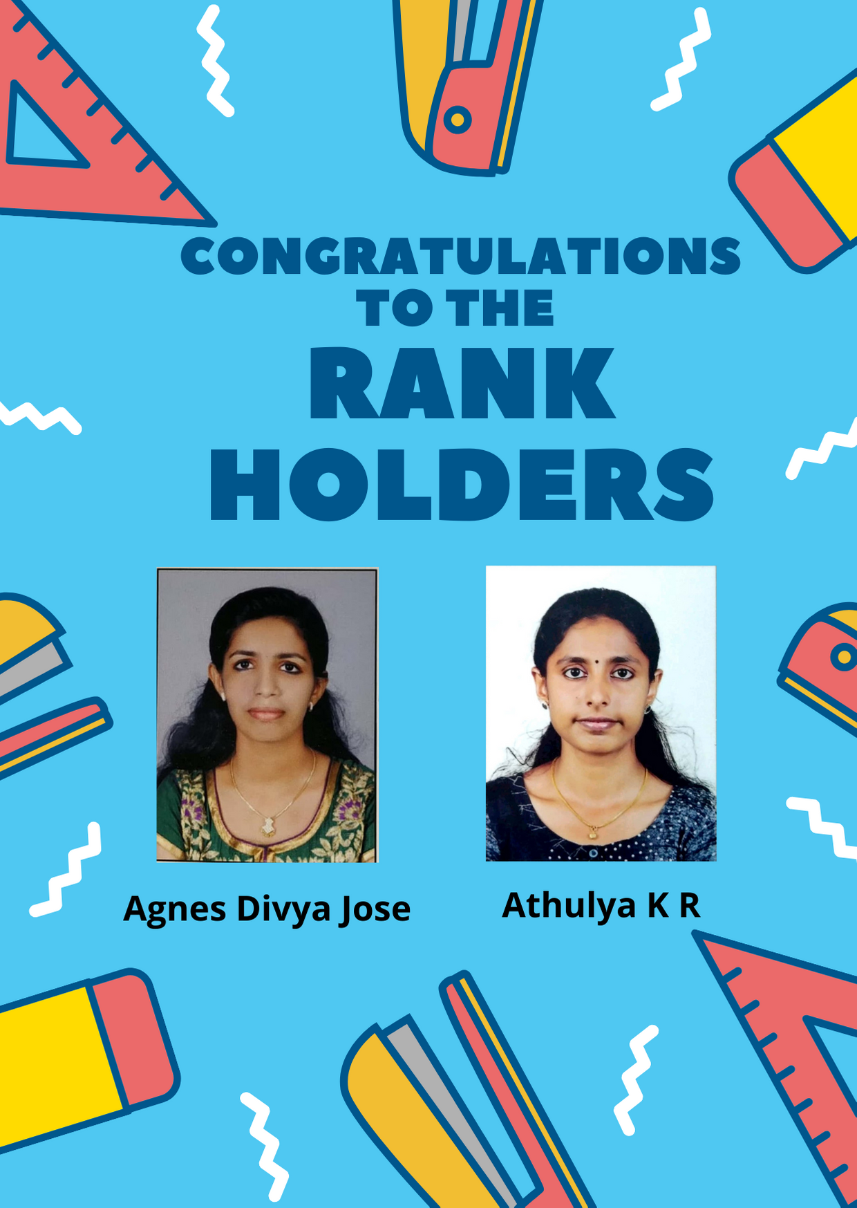 We are proud to announce that Agnes Divya Jose and Athulya K R (MSc Chemistry) secured 4th and 8th rank respectively in the MG University Examinations.