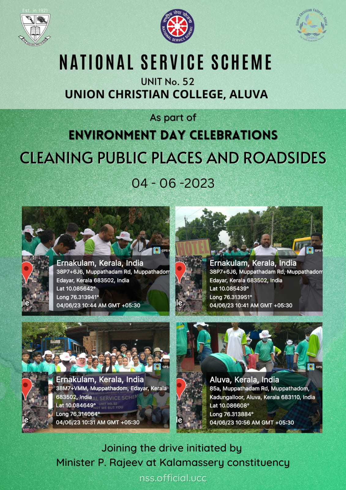 As part of environment day celebrations, the Union Christian College NCC unit joined the drive initiated by Hon. Minister P. Rajeev and cleaned public places of Kalamassery Constituency on 4th June 2023. An initiative to plant 100 trees in the college campus was also started by the NSS unit.